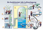 The air is drawn in large compressors for compression. The gas mixture is cooled until its liquid stage in heat exchangers. This occurs at extremely low temperatures of up to negative 196 degrees. Since the individual air components vaporize at different temperatures, they can be separated in tall separation columns and extracted in their pure form.