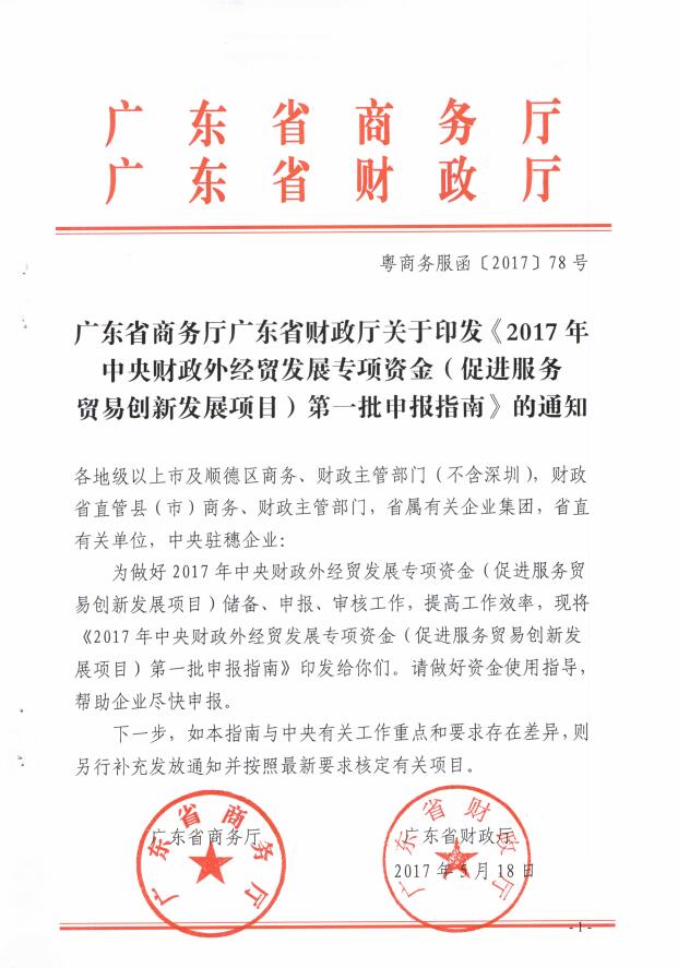 转发 广东省商务厅 广东省财政厅关于印发《2017年中央财政外经贸发展专项资金(促进服务贸易创新发展项目)第一批申报指南》的通知
