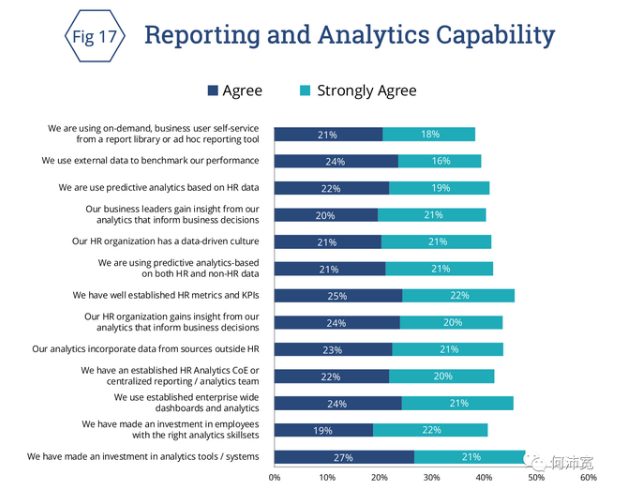 48%的受访公司表示,他们在分析工具/系统方面进行了投资。47%的公司拥有完善的人力资源指标、关键绩效指标和企业范围的仪表盘。超过40%的受访者表示,他们已投资于拥有正确分析技能的员工,并建立了一个正式的人力资源分析CoE或集中的报告和分析团队。与此同时,许多受访者表示,他们并没有引进合适的人才,以使这些投资的回报最大化。