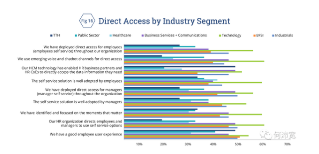 按行业、公司分类,在直接接入部署方面,技术和商业服务/通信部门比医疗、公共部门和旅游、旅游和酒店业显示出更大的成熟度(参见图16)。