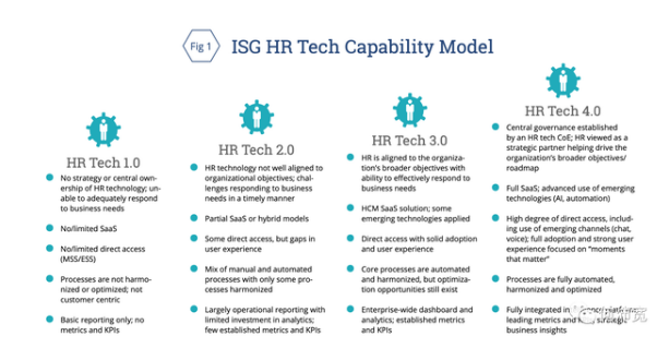 美国的信息服务商ISG做了一份关联报告:《迈向数字时代:2019年人力资源技术和服务交付的行业趋势》(《MOVING UP THE DIGITAL LADDER: 2019 Industry Trends in HR Technology and Service Delivery》),它梳理了美国人力资源技术和服务(线上化HRTech为核心)的行业现状,基于现有问题提出了一些思考方向:对人力资源行业的挑战和机会是什么,如何进一步推动企业通过升级人力资源技术能力完成数字化转型?