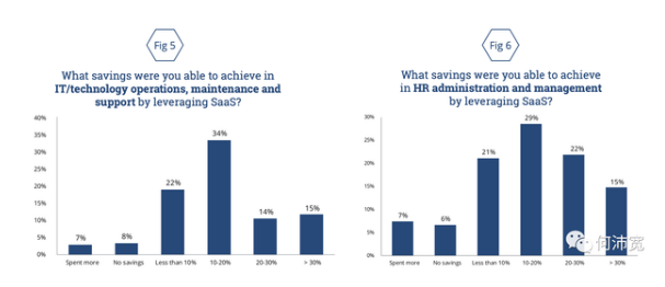 大多数部署SaaS的公司都希望实现降低人力资源和IT成本。虽然SaaS不一定会直接节约成本,下面的图5和图6证实了降低成本的预期(间接降低成本)是可以实现的。数据显示,部署SaaS的公司中,约有一半能够在IT/技术运营和人力资源管理两个领域降低10%到30%成本,另外15%的公司在这两个领域降低30%或更多成本。