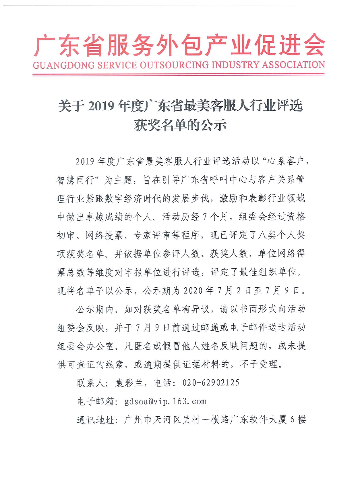 关于2019年度广东省最美客服人行业评选获奖名单的公示