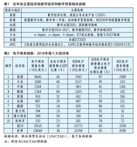 随着全球范围内网络普及率的提升和数字经济的发展,数字贸易快速发展。据国际通信协会统计,2013年全球有23亿人能上网。而据《数字2020:全球概览》报告,到2020年初已有45亿人使用网络、38亿人使用社交媒体。对亚洲和太平洋地区来说,过去十年通信连接的增长快于世界平均水平。移动手机和光纤网络的使用,进一步提高了在线连接度。这些都促进了贸易向在线交易转变,原有的实体市场部分转变为电商平台。与此同时,数字经济的快速发展推动了数字贸易的发展。随着互联网、云计算、大数据、物联网、金融科技与其他新的数字技术发展,并应用于信息的采集、存储、分析和共享过程中,改变了信息共享和社会互动方式,改造了生产、销售模式,同时也诞生了数字经济。2016年G20杭州峰会通过的《二十国集团数字经济发展与合作倡议》中将数字经济概括为,“以使用数字化的知识和信息作为关键生产要素、以现代信息网络作为重要载体、以信息通信技术的有效使用作为效率提升和经济结构优化的重要推动力的一系列经济活动”。近年来,不少国家制定了专门的发展战略来促进数字经济发展。例如,美国2018年出台了《美国国家网络战略》。新冠肺炎疫情暴发后,各国均加快了数字化转型。总体来看,数字经济仍呈较快发展之势。从全球来看,据中国信通院《全球数字经济图景(2020年)》报告,2019年全球数字经济增加值规模达31.8万亿美元,同比增长5.3%;其中,高收入国家占比较高。在该报告统计的47个经济体中,34个高收入国家数字经济规模占到了76.9%。伴随着数字技术和数字经济发展,涌现出越来越多的数字化产品,越来越多的服务可在线提供, 这些都推动了数字贸易的发展。例如,电子书、数字影像、数字音乐、动漫、电游、软件等数字产品愈发丰富,还有搜索引擎、社交媒体、卫星定位、远程医疗、远程教育等。关于全球数字贸易的规模,从数字贸易定义出发,主要有两种统计口径的数据,一是电子商务,二是数字服务贸易。关于电子商务。据联合国贸发组织(U N C T A D)数字经济报告数据,全球电子商务销售额2017 年就已达到29万亿美元,相当于GDP的36%,比上年增长13%。跨境电商方面,2017年全球跨境电商商品销售额达4120亿美元, 占到B2C销售的11%,比2015年增长7%。2017年全球15岁以上的人口中已有1/4的人在网上购物,人数比2016年增长12%。可见,未来,随着电信等基础设施的完善和发展中国家的经济发展以及全球消费习惯的转变,跨境电商仍有很大发展潜力。从全球电子商务销售的国别结构看,美国、日本、中国、韩国、英国分别列电子商务销售额前五名(如表2所示)。从电子商务销售额占GDP比重看,韩国、日本、美国较高。在全球电子商务销售额排名前十的国家中,我国B2B电子商务销售占比相对较低。从全球消费者在电子商务中消费的商品/服务结构看,旅游(包括住宿)、服装等时尚品、电子产品、玩具和DIY等爱好品、食品和个人护理品、电子游戏、数字音乐依次是消费最多的几大品种。关于数字服务贸易(这里是指可通过互联网进行远程交付的产品和服务,不仅包括ICT服务产业、数字媒体产业等几乎全部通过数字化手段进行交付的服务,还包括养老、金融、知识产权等可数字交付程度较高的服务)。据UNCTAD 数据,2008-2018年,全球数字交付贸易出口规模从18379.9亿美元增长到29314.0亿美元,增长接近60%,年均增长约5.8%,其中,服务贸易出口年均增长3.8%,占比从45.66%增长到50.15%。从国别结构看,发达经济体是数字服务贸易的主体,2018年美国和欧盟的数字服务出口在世界数字服务出口中合计占比超过65%。从服务构成看,2018年占比最高的5 类数字服务贸易分别是工程研发、保险金融、知识产权、计算机、管理咨询,分别在数字服务出口中占25.8%、21.4%、16.9%、16%和13.6%。电信、文化娱乐、信息服务出口分别仅占3.15%、1.87%、1.28%(引自中国信通院,《数字贸易发展与影响白皮书(2 0 1 9 年)》)。