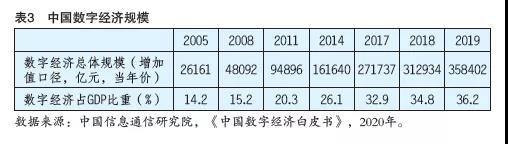 我国的跨境数字贸易也是在数字经济发展中产生并与之相互促进的。近年来,我国数字经济蓬勃发展,已成为国民经济的核心增长极之一。根据中国信通院发布的《中国数字经济白皮书(2020年)》数据,从2005年到2019年,我国数字经济增加值规模由2.6万亿元扩张到35.8万亿元;数字经济占GDP 比重从14.2%升至36.2%(如表3所示),在国民经济中的地位进一步凸显。数字经济持续高速增长, 2019年名义增长15.6%,高于同期GDP名义增速约7.85个百分点,成为应对经济下行压力的关键抓手。国际比较发现,我国数字经济规模排全球第二位,仅次于美国;但从数字经济占GDP比重这一相对指标看,我国依次低于德国、英国、美国、韩国、日本、爱尔兰、法国、新加坡(数据引自中国信通院,《全球数字经济新图景(2020 年)》)。在IMD世界数字竞争力排名中,我国被排在22名(该项数字竞争力排名分析一国在多大程度上采用和开发引领政府实践、企业模式、社会发展的数字技术。排名方法中考虑到了知识、科技、未来准备度三种因素)。电子商务在我国发展尤为迅速。2019年我国电子商务交易额达34.81万亿元,网上零售额10.63万亿元。2016年开始,我国电子商务从超高速增长期进入相对稳定的发展期,但跨境电子商务继续保持高速增长态势。根据海关总署统计数据,2018年中国跨境电子商务进出口商品总额为1347亿元,同比增长50%。其中进口785.8亿元, 增长39.8%;出口561.2亿元,增长67%。2019年我国跨境电商进出口商品总额达到1862.1亿元,已是2015年的5倍(年均增长49.5%), 当年同比增长38.3%;其中出口为944亿元,进口为918.1亿元,出口量首次超过进口量。