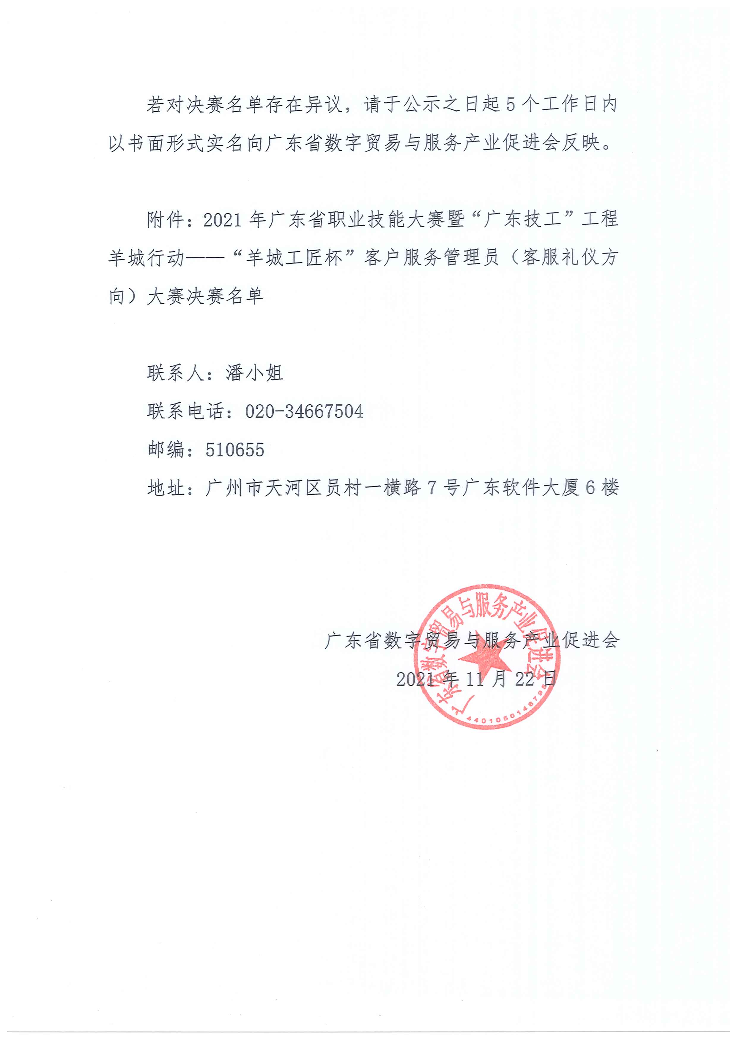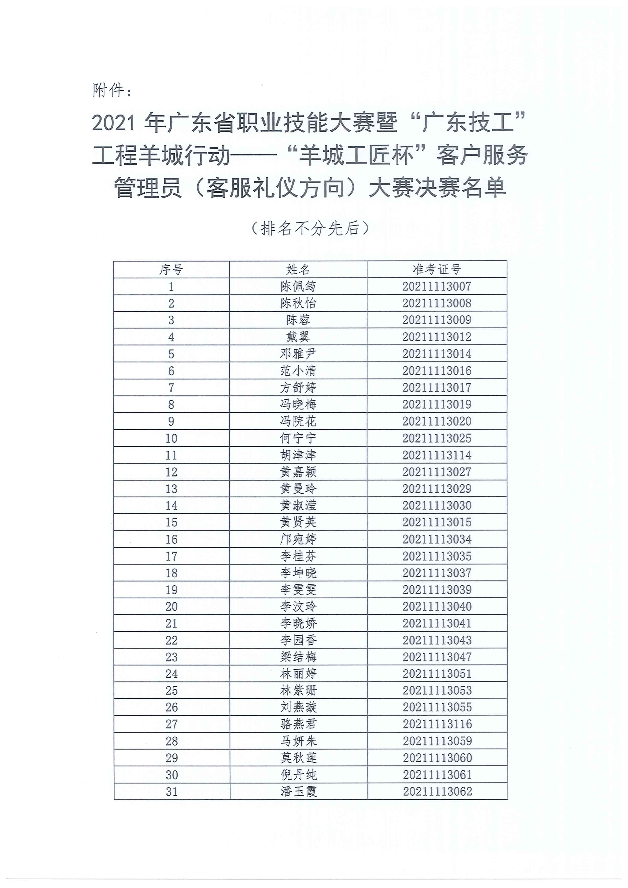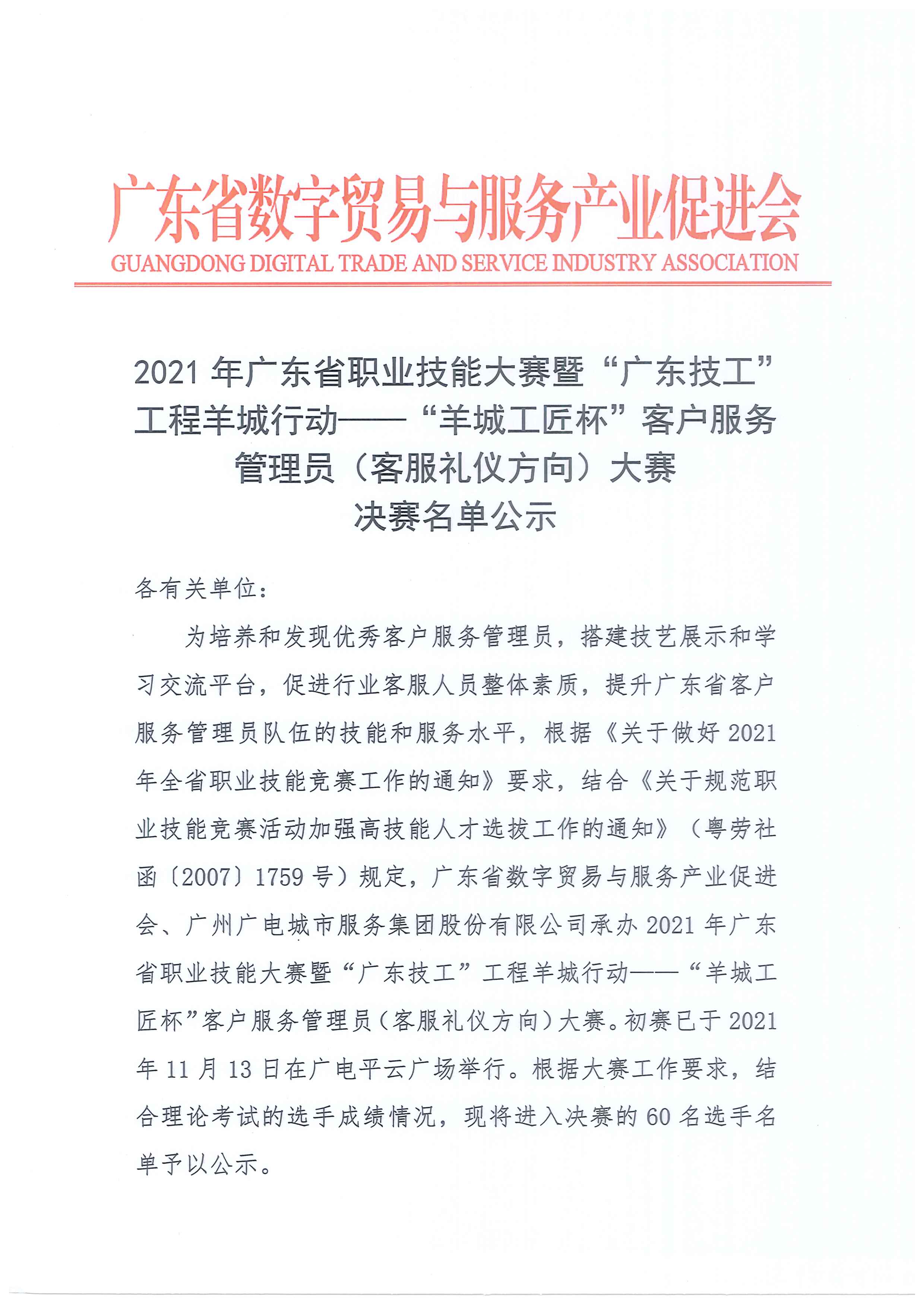 2021年广东省职业技能大赛暨“广东技工”工程羊城行动——“羊城工匠杯”客户服务管理员(客服礼仪方向)大赛决赛名单公示