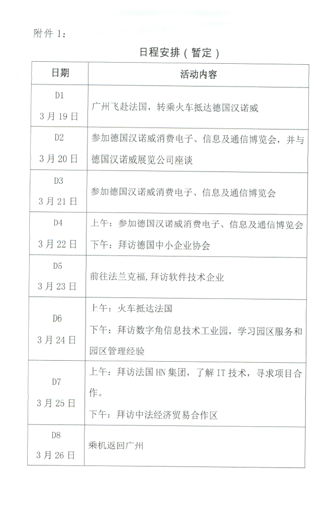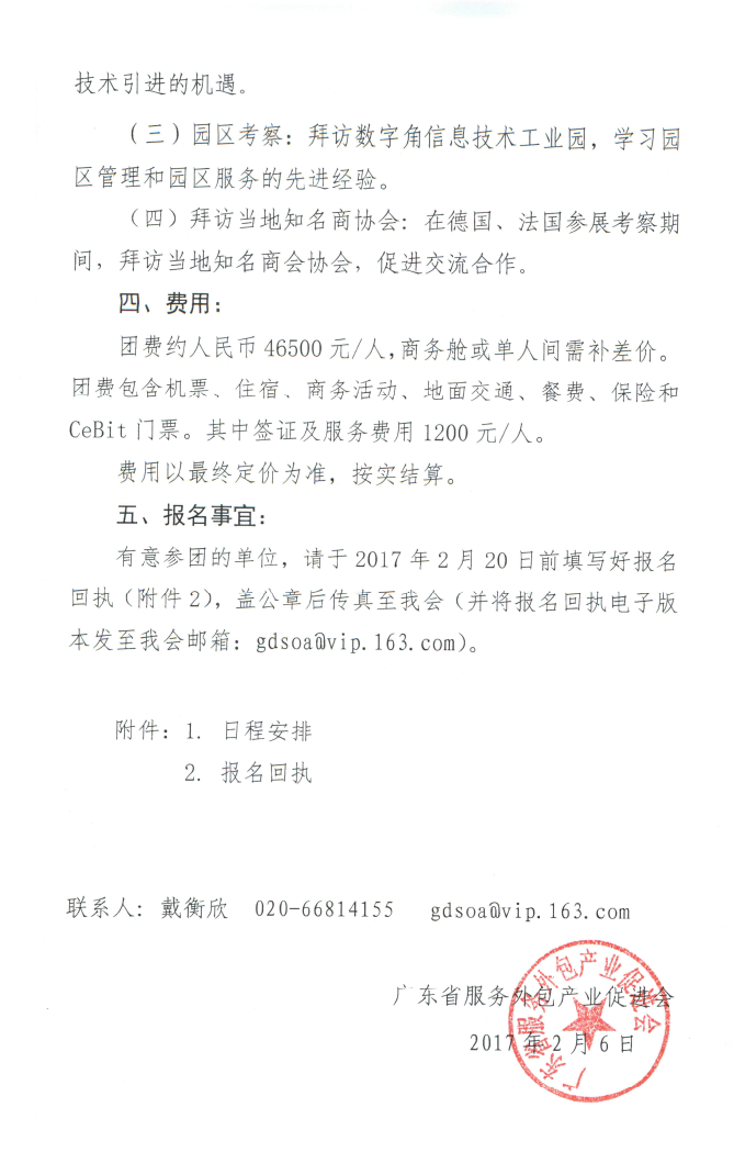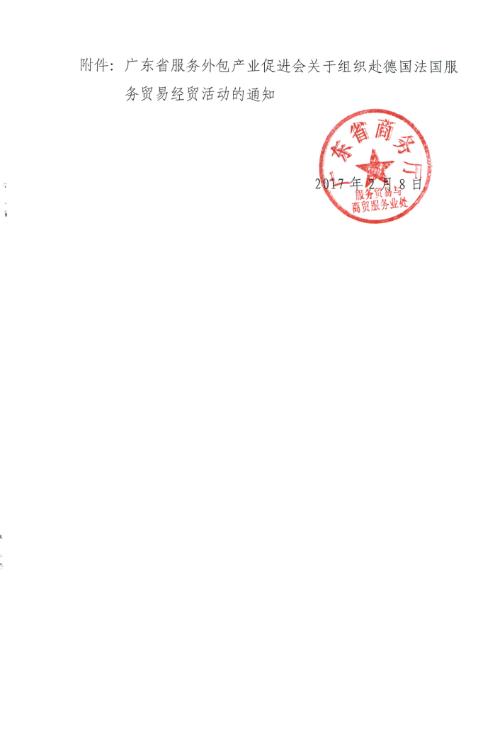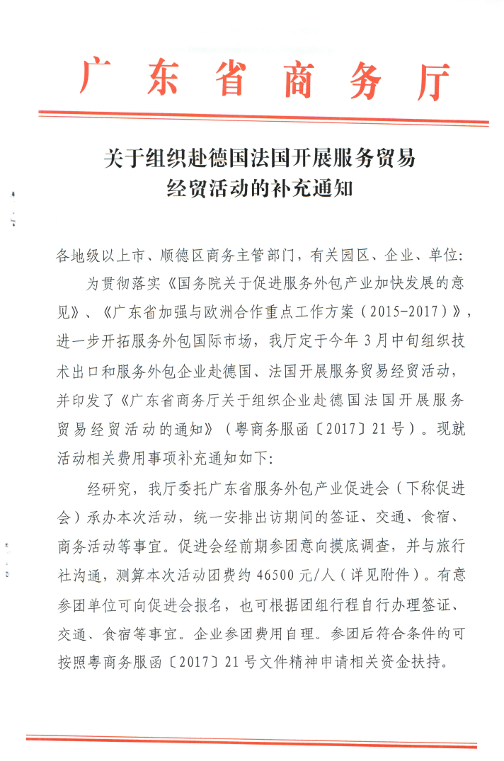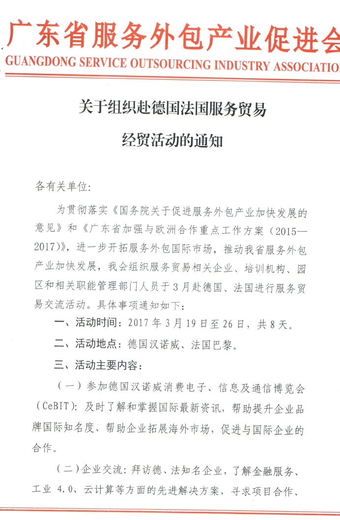 为贯彻落实《国务院关于促进服务外包产业加快发展的意见》、《广东省加强与欧洲合作重点工作方案(2015—2017)》,进一步开拓服务外包国际市场,推动我省服务外包产业加快发展,广东省商务厅于今年3月19-26日组织广东服务贸易交流团(以下简称交流团)赴德国、法国进行业务交流对接活动,广东省服务外包产业促进会组织企业参加。